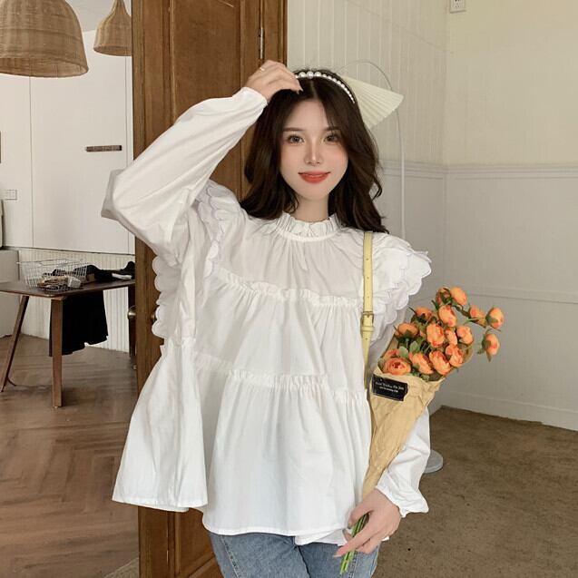 肩のフリルが可愛らしい印象の長袖ブラウスです。