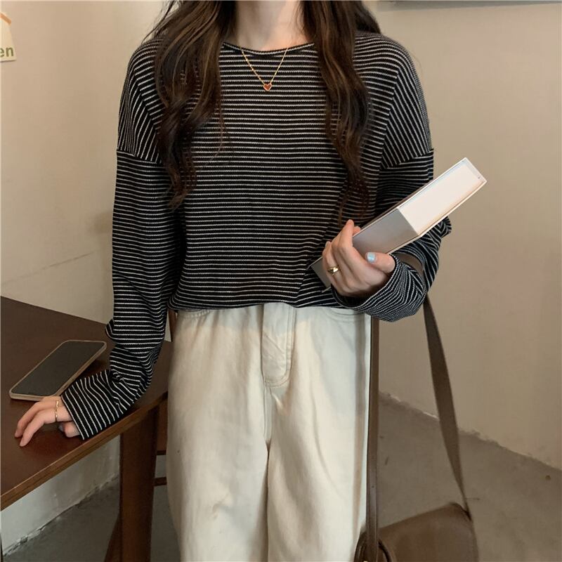 トップス カットソー 袖あり 長袖 ラウンドネック 大人可愛い きれいめ シンプル カジュアル 大人 上品 おしゃれ お洒落 大人女子 こなれ感 ラフ ボーダー 春 秋 冬 2022 2023 10代 20代 30代 40代 50代 60代 レディース 女性用 学生 通学 デート お出かけ 女子会 休日 旅行 普段使い 重ね着 ファッション コーデ スタイル フリーサイズ 黒 ブラック 茶色 ブラウン オフホワイト