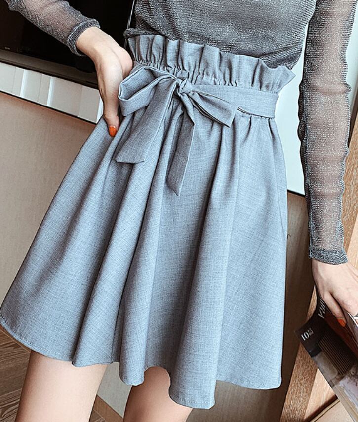 ハイウエストで脚長効果あり。Aラインのフレアシルエットがラブリーで、ウエスト部分に大きめのリボンを付けたガーリーなデザインです。