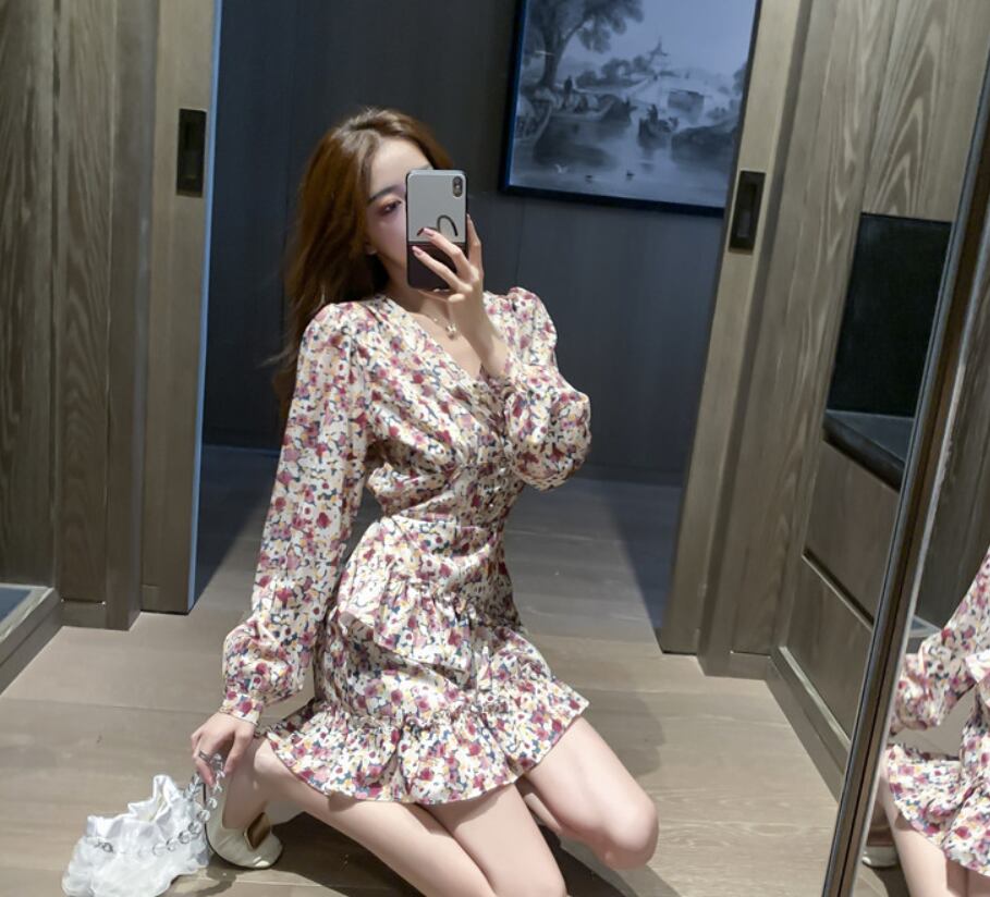 Aラインの切り替えデザインで、ウエストからヒップにかけて広がりを持たせ、スタイルアップにも期待できます。Vネックでデコルテを美しく見せるとともに、前開きにすることで、全体に抜け感を演出します。大人可愛い花柄が、幅広いシチュエーションにマッチ。秋や春などの季節にぴったりで、デートからオフィスやビジネスまで使いやすいアイテムです。