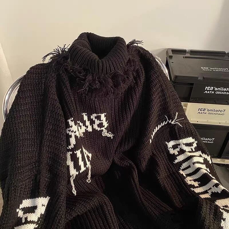 ロゴやダメージ加工が個性的なタートルネックニットです。