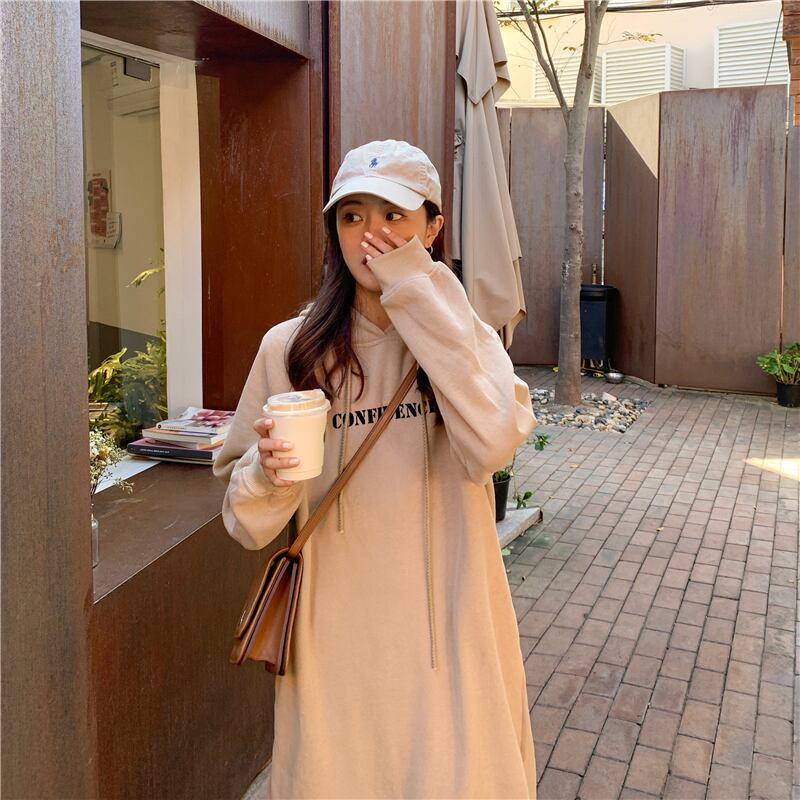 胸元のロゴがワンポイントのフード付きワンピースです。