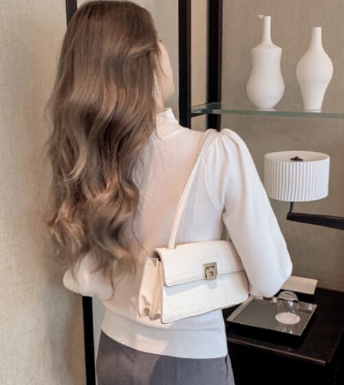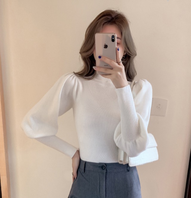 ランタンスリーブがかわいい、ハーフタートルネックのニット。