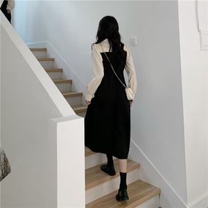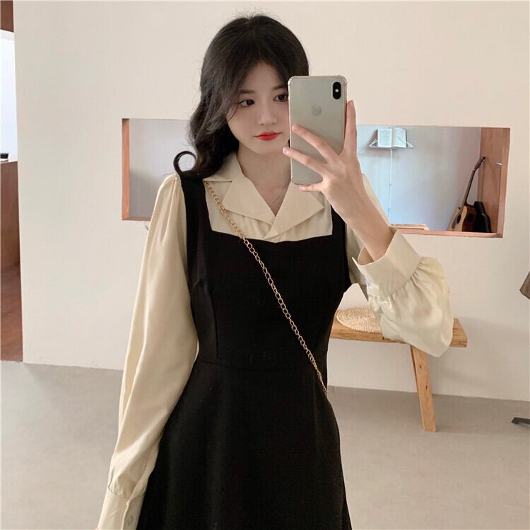 2023 春の新大サイズ韓国語バージョンツーピースの長袖のドレスの女性の春と秋のフレンチスタイルの穏やかな風のフェイクツーピースロングスカート