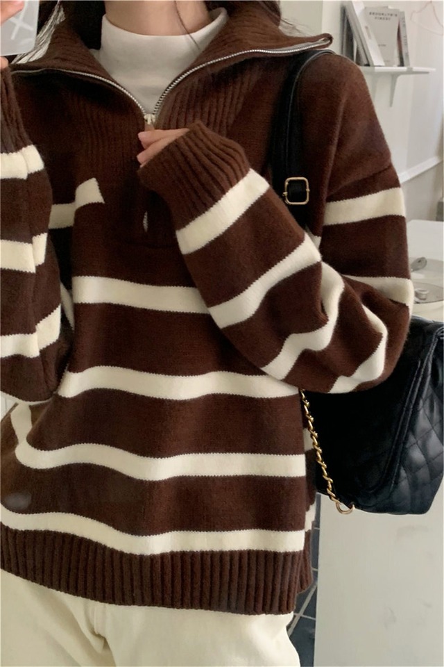 ルーズハーフジッパーラペルストライププルオーバーセーター女性の秋と冬のカジュアル怠惰なスタイルテクスチャード長袖ニットトップ大人っぽいボーイッシュなスタイルが好きな方におすすめです。袖ありで長袖なので、春や秋は1枚で、冬はアウターの中にも着られるので、季節を問わずに活躍してくれます。フリーサイズなので、体型を気にしなくても安心です。