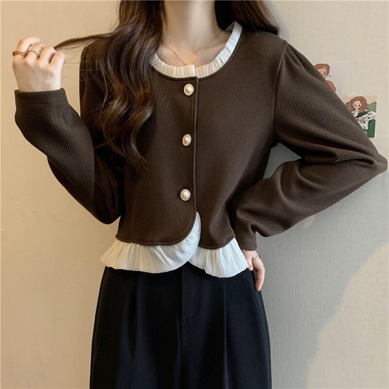 フレンチシフォンスプライシングスモールフレグランストップ女性用春と秋のファットミリカバーベリー長袖仕様で着回し力抜群。ゆったりとしたシルエットは動きやすく、着心地も快適です。肩のフリルデザインやシフォン素材が女性らしさを引き出し、オシャレ感もUP!春夏秋冬、季節を問わずに活躍できるのも嬉しいポイント。おしゃれな大人女子の必需品です。