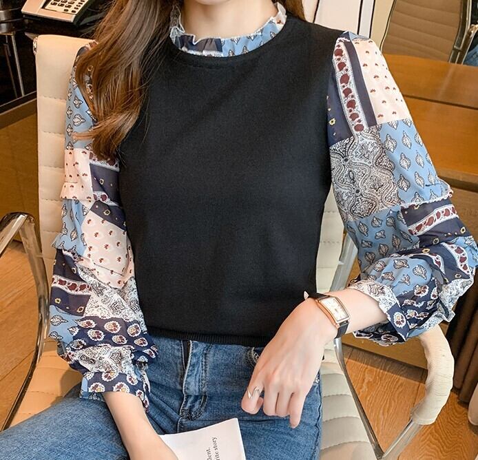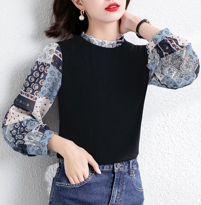 ステッチフェイクツーピース長袖シフォンシャツ女性の2023年春の新しいニッチシックなプリントトップウエスタンスタイルのシャツ大人女子の上品且つエレガントコーデです