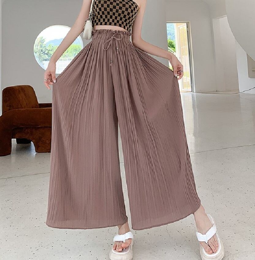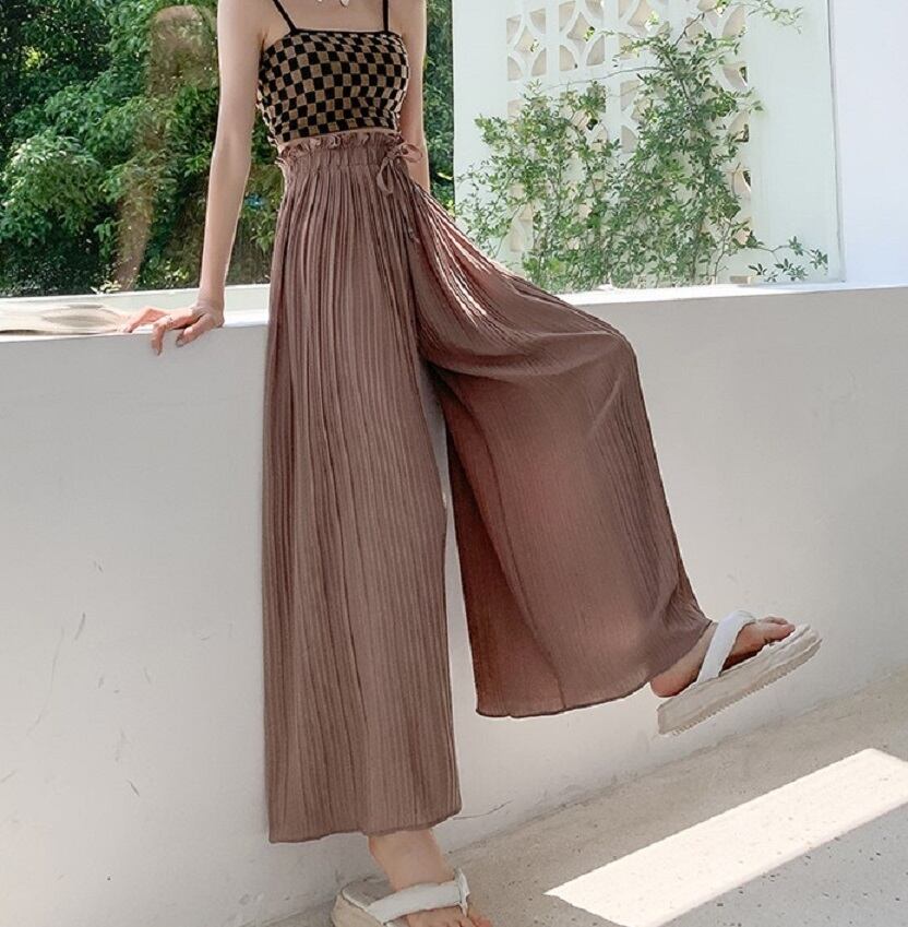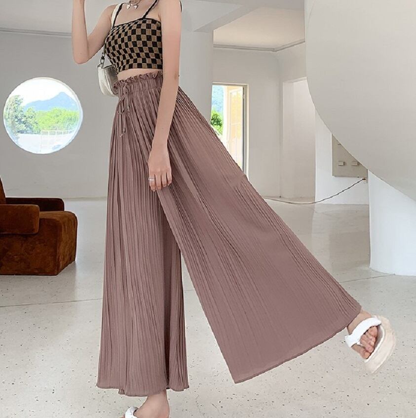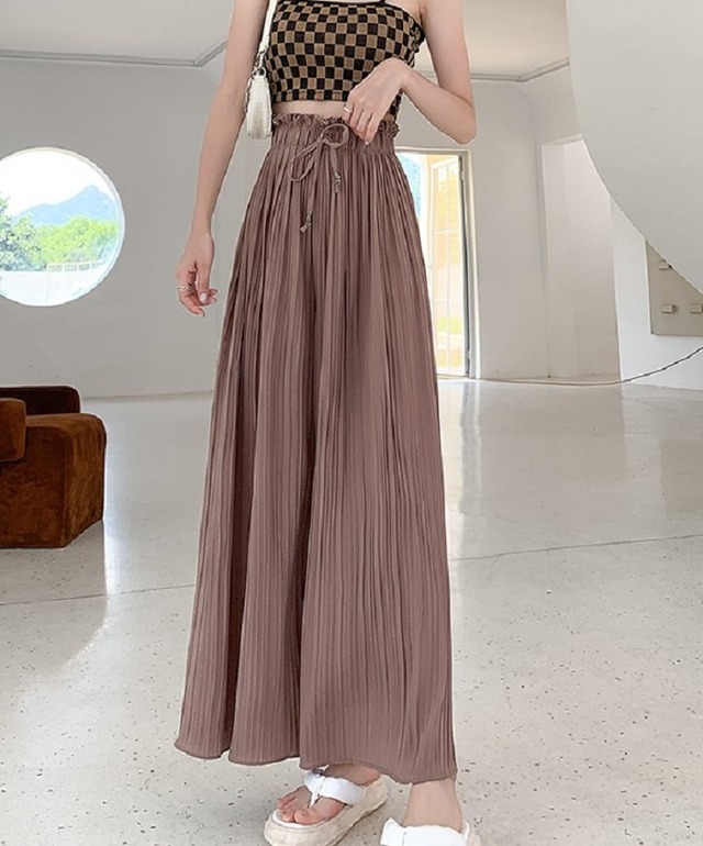 ハイウエストシフォンプリーツワイドガウチョパンツたっぷりとギャザーをよせたボリューム感が可愛いウエストはリボンベルト付きでアクセントに。大人っぽくしなやかな上品な女性らしさを演出してくれます。