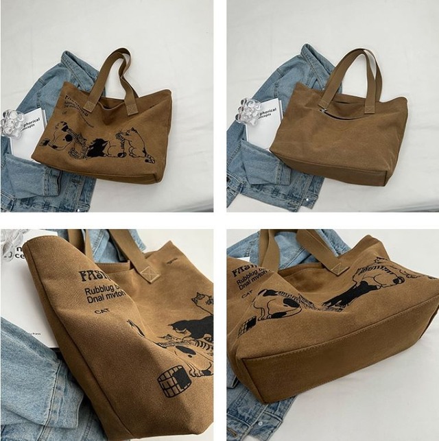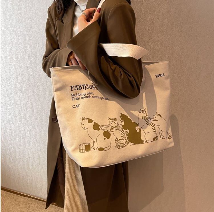 普段使いはもちろん、通勤や通学、旅行など、様々なシーンで活躍する大容量のキャンバストートバッグ。手持ちでも、付属の長めショルダーで肩から掛けてもOK。おしゃれなネコのプリントが、普通のバッグよりもワンランク上のこだわり感を演出してくれます。