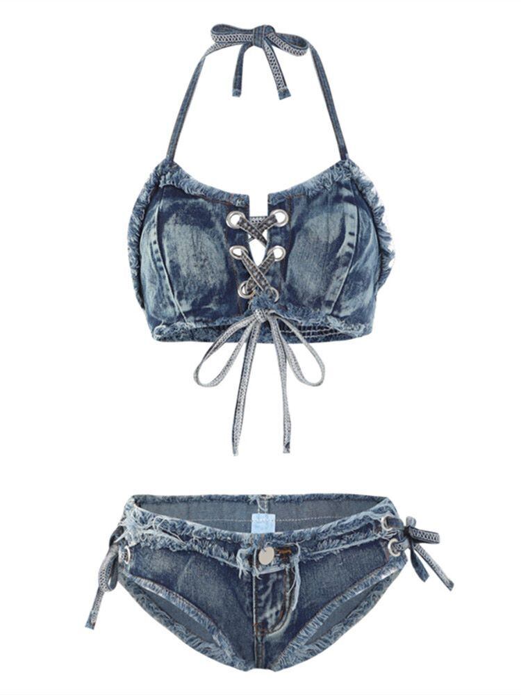 ホルターネック ストラップ デニム ビキニ 水着 ショートパンツ 胸元 谷間魅せ セット 大人可愛い セクシー 大人っぽい おしゃれ 個性的 クール 無地 レディース 春 夏 海 ビーチ プール リゾート 旅行 スポーツ スタイルアップ 韓国 スタイル 新作 送料無料 インスタ映え S M L