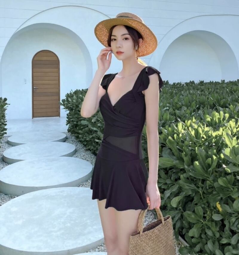 セクシーでありながらも上品なデザインが魅力のワンピース水着です。女性らしいカーブを引き立てるフィット感のあるデザインで、夏のビーチやプールでホットなスタイルを演出します。腹部をカバーするスカートスタイルで、自信を持って水着を楽しむことができます。
