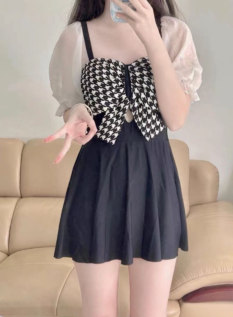 ワンピース水着 千鳥柄リボン パフスリーブ 体系カバー水着 ワンピース 胸元 大人可愛い セクシー 大人っぽい おしゃれ キュート レディース 春 夏 海 ビーチ プール リゾート 旅行 体系カバー 美スタイル 韓国 スタイル プレゼント 送料無料 流行 S M L XL