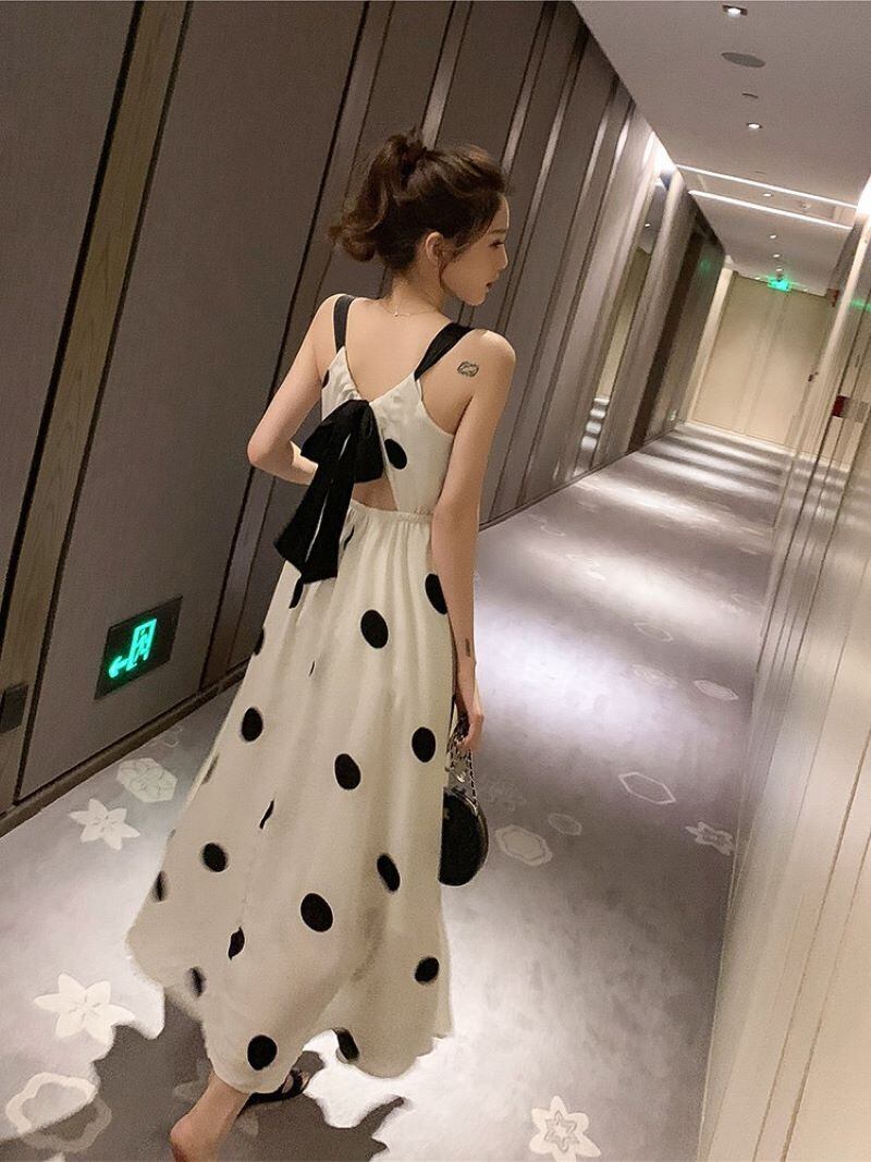 ワンピース フレアワンピース ロング丈 ノースリーブ Vネック フレア Aライン バックリボン 大人可愛い おしゃれ 大人女子 キュート 存在感 ドット柄 春 夏 秋 レディース デート お出かけ 女子会 休日 旅行 海 ガーデン 普段使い 韓国 ファッション スタイル 楽ちん 体系カバー 送料無料 M L XL 2XL 3XL 4XL ゆったり ホワイト ブラック