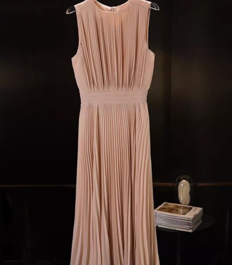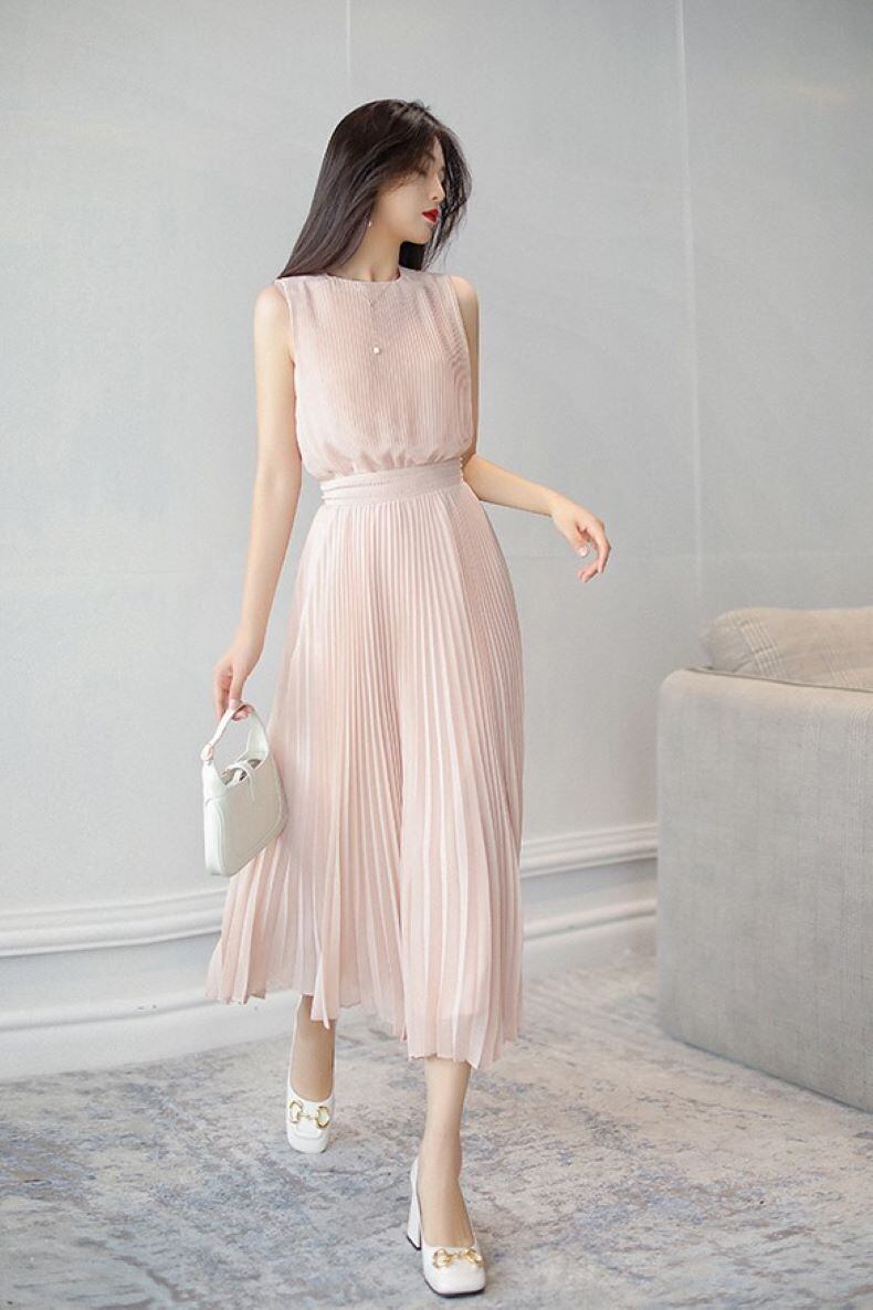ワンピース フレアワンピース ロング丈 ノースリーブ Uネック Aライン プリーツ シフォン ウエストゴム きれいめ 大人 上品 おしゃれ お洒落 大人女子 エレガント 無地 春 夏 秋 レディース オフィス デート お出かけ 休日 旅行 普段使い 韓国 ファッション スタイル 体系カバー プレゼント 送料無料 S M L XL ピンク