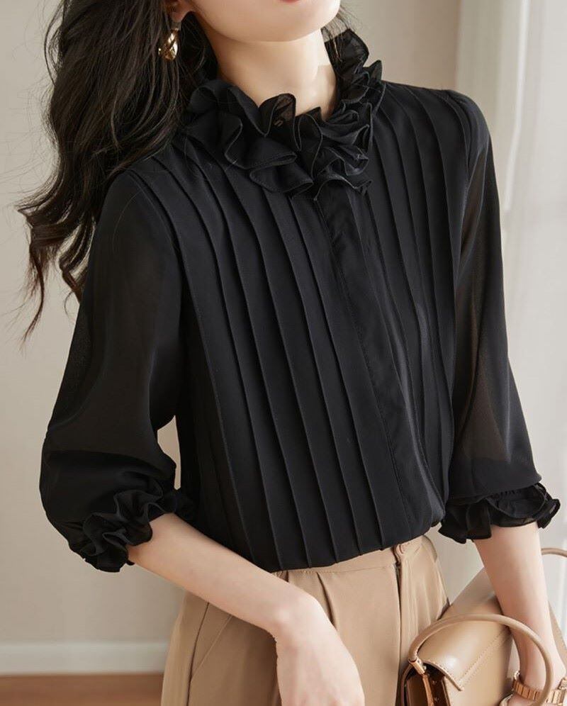 フリルブラウス トップス シャツ ブラウス 長袖 大人 上品 おしゃれ エレガント 春 秋 レディース デート お出かけ 休日 旅行 普段使い 韓国 ファッション スタイル 送料無料 S M L XL 2XL ゆったり ホワイト ブラック