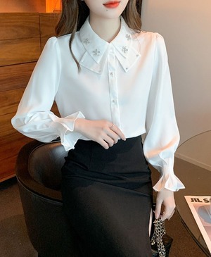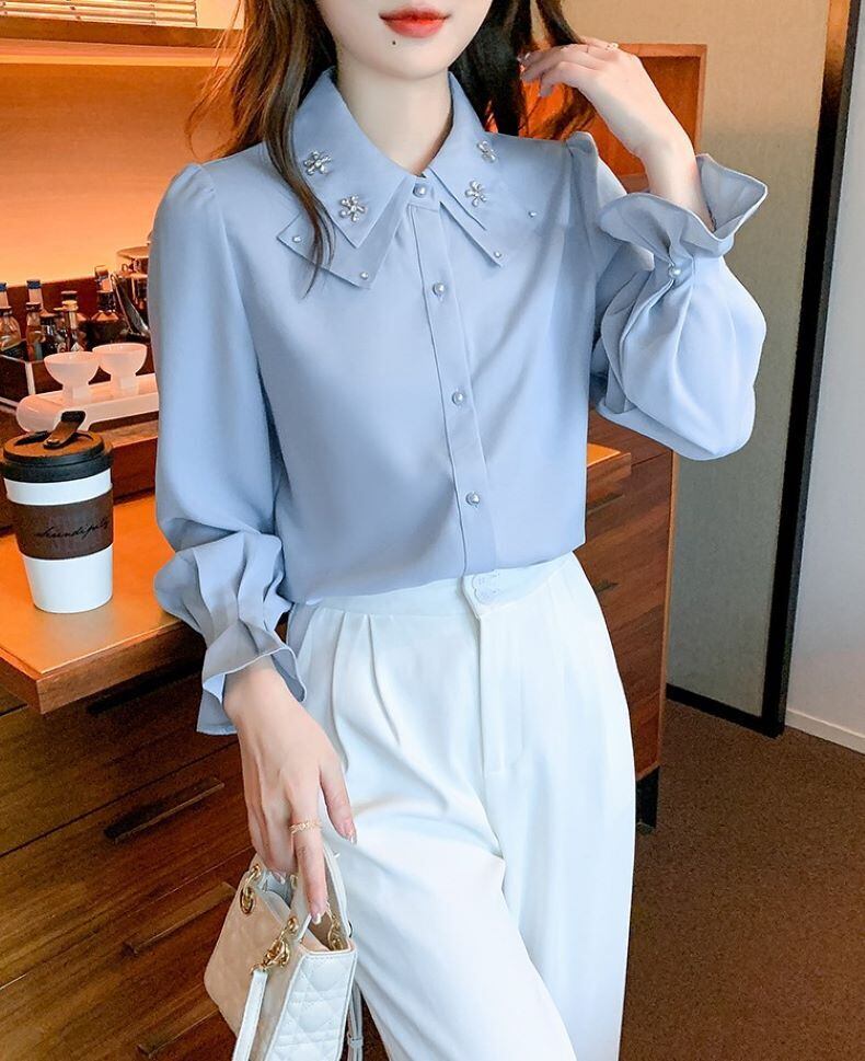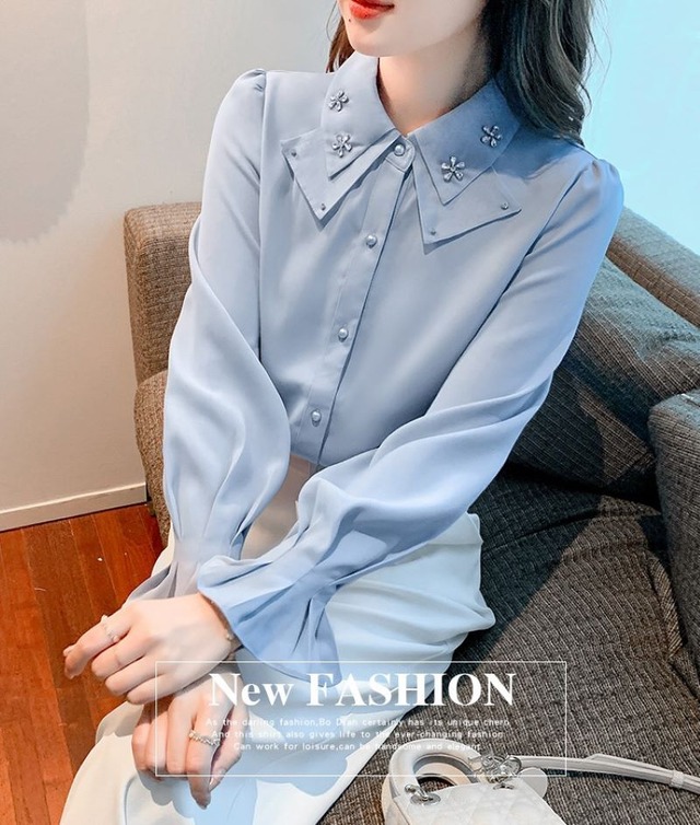 フリルブラウス トップス シャツ ブラウス 長袖 襟付き シフォン きれいめ 大人 上品 おしゃれ お洒落 大人女子 エレガント 春 夏 秋 レディース お出かけ 休日 旅行 普段使い 韓国 ファッション 送料無料 S M L XL 2XL ホワイト ブルー ピンク