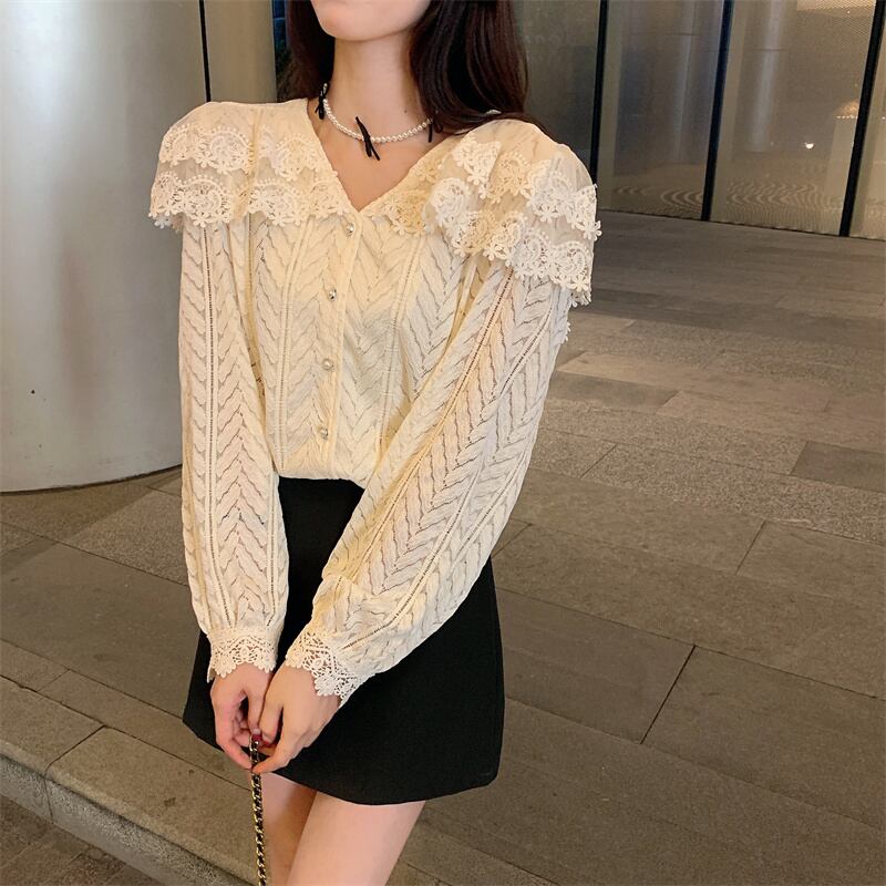 フリル刺繡 Vネック トップス シャツ ブラウス 長袖 Vネック 襟付き レース 刺繍 きれいめ 大人 上品 おしゃれ 大人女子 クール エレガント 春 夏 秋 レディース デート お出かけ 休日 旅行 普段使い 韓国 ファッション スタイル 送料無料 S M L XL 2XL 3XL 4XL ベージュ