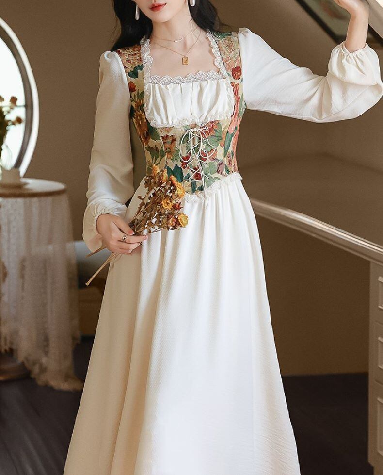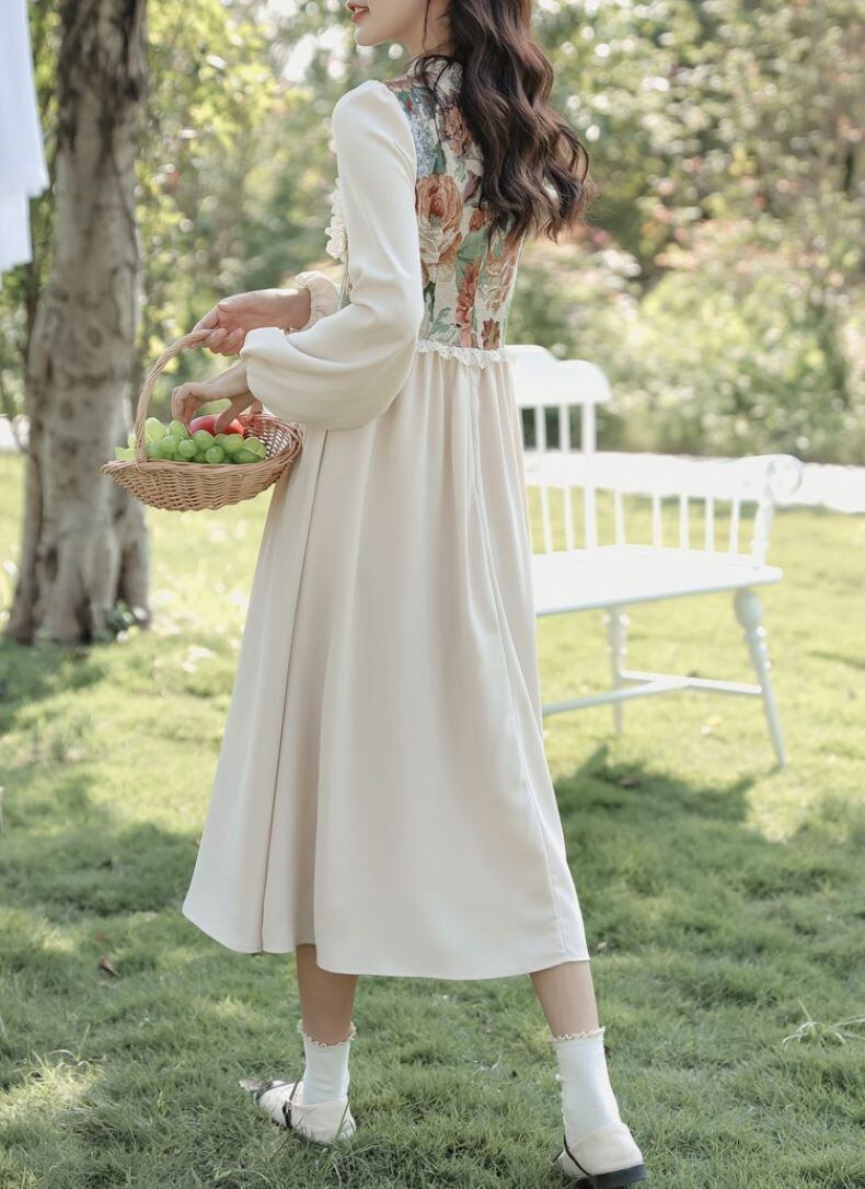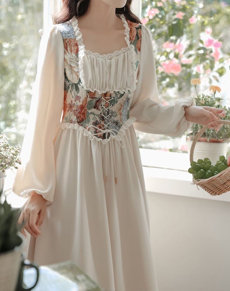 フロントレーストリム フラワーコルセット ワンピース フレアワンピース ロング丈 長袖 切り替えデザイン きれいめ 大人 上品 アジアン 個性的 エレガント フラワー 春 夏 秋 レディース デート お出かけ 休日 パーティー イベント 旅行 普段使い 韓国 ファッション スタイル プレゼント 送料無料 S M L XL ベージュ
