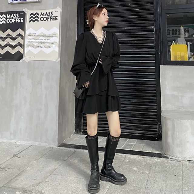 ワンピース ショート丈 長袖 ボリューム袖 Vネック レース バブルスリーブ ティアードミニワンピース ティアードフリル ハイウエスト シンプル カジュアル かっこいい ボーイッシュ クール 無地 春 秋 冬 レディース デート お出かけ 休日 旅行 普段使い 韓国 ファッション スタイル 楽ちん 体系カバー 送料無料 M L XL 2XL 3XL 4XL ブラック