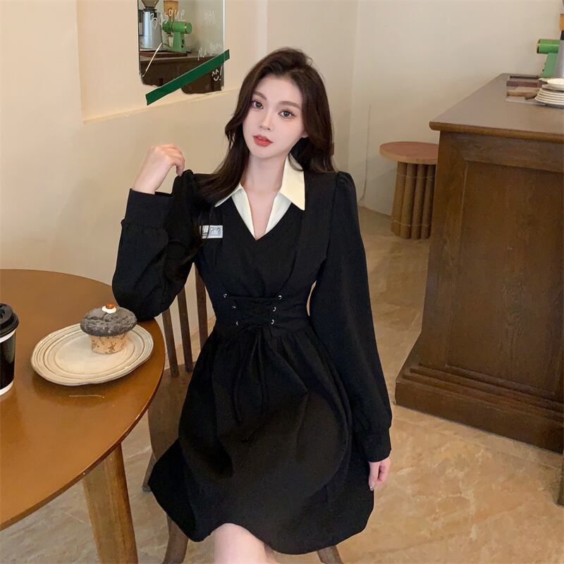 ワンピース フレアワンピース ショート丈 袖あり 長袖 襟付き Aライン リボン ウエストリボン 大人可愛い カジュアル 大人 おしゃれ 個性的 セクシー 無地 春 秋 冬 レディース デート お出かけ 休日 旅行 普段使い 韓国 ファッション スタイル 楽ちん 体系カバー 送料無料 M L XL 2XL 3XL 4XL 大きめ ゆったり ブラック
