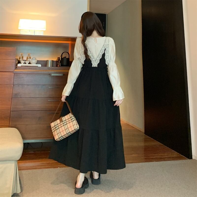 ワンピース フレアワンピース ロング丈 長袖 Uネック Aライン 切り替えデザイン レース フリル ウエストマーク ドッキング 大人可愛い 大人 上品 おしゃれ エレガント 無地 春 秋 冬 レディース デート お出かけ 休日 旅行 普段使い 韓国 ファッション スタイル 楽ちん 体系カバー 送料無料 M L XL 2XL 3XL 4XL ブラック