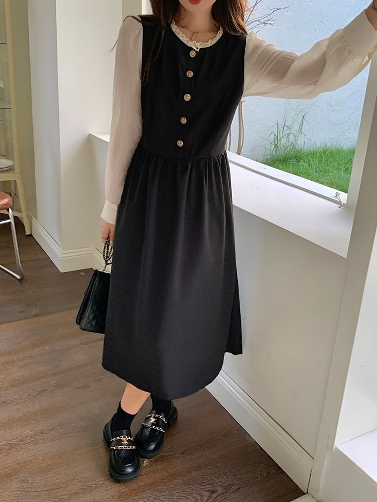 ワンピース フレアワンピース ロング丈 長袖 Uネック Aライン 切り替えデザイン ウエストマーク 大人可愛い 大人 上品 おしゃれ エレガント 無地 春 秋 冬 レディース デート お出かけ 休日 旅行 普段使い 韓国 ファッション スタイル 楽ちん 体系カバー 送料無料 M L XL 2XL 3XL 4XL ブラック