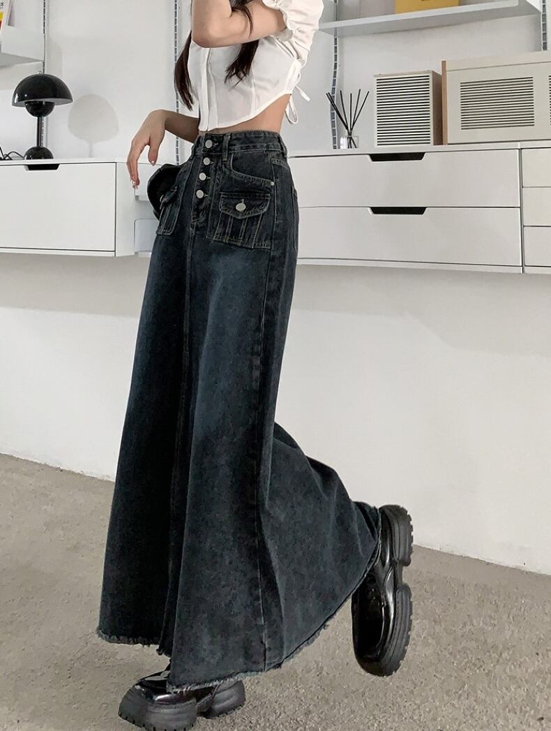 スカート デニムスカート ロング丈 ワイド Aライン ポケット デニム かわいい カジュアル 大人 上品 おしゃれ 存在感 無地 オールシーズン レディース お出かけ 休日 イベント 旅行 普段使い 韓国 ファッション スタイル 体系カバー プレゼント 送料無料 流行 S M L XL 2XL 3XL 4XL 5XL