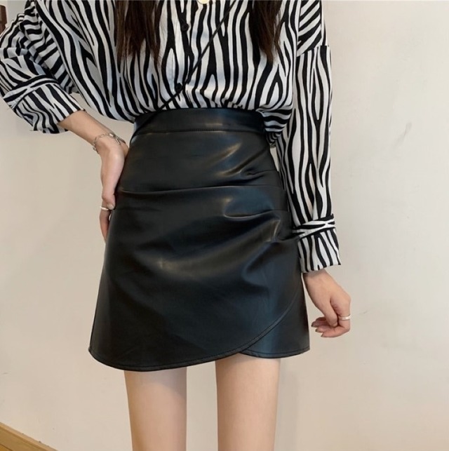 エレガントなデザインが魅力のフェイクレザースカート。不規則な形状とミニ丈の組み合わせが、大胆で個性的なスタイリングを楽しませてくれます。シンプルなワンカラーのレザー調素材が高級感を演出し、どんなトップスとも相性抜群です。