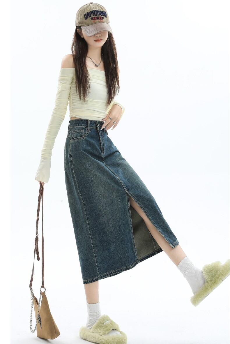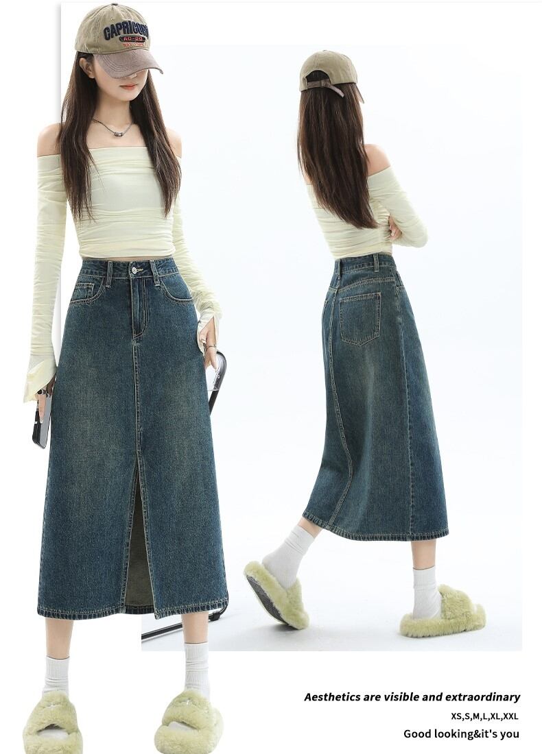 センタースリット ハイウエスト ウォッシュデニムスカート スカート デニムスカート ミモレ丈 Aライン スリット デニム かわいい シンプル カジュアル かっこいい 無地 オールシーズン レディース 通学 お出かけ 休日 旅行 普段使い 韓国 ファッション スタイル 楽ちん 送料無料 XS S M L XL
