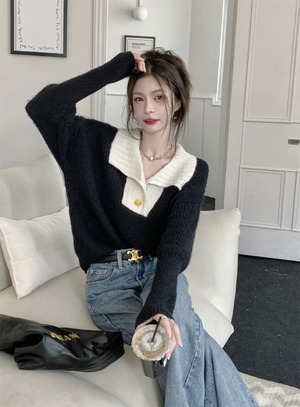 トップス 襟付き カットソー セーター プルオーバー 長袖 Vネック ニット 秋 冬 レディース デート お出かけ 休日 旅行 普段使い 韓国 ファッション スタイル 暖かい 送料無料 フリーサイズ