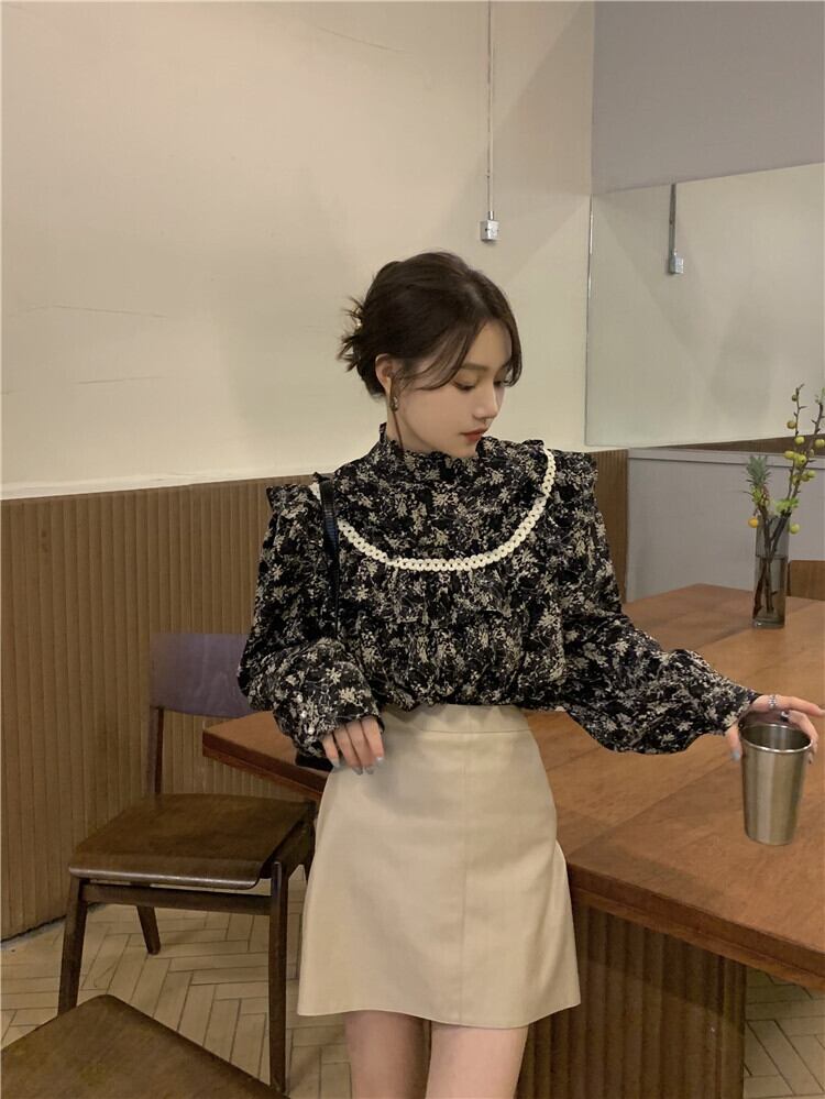フラワー ブラウス 総柄 ハイネック フェミニン フリル ブラウス トップス シャツ 小花柄 フラワー 長袖 モノトーン 肩フリル 大人可愛い 大人 おしゃれ お洒落 大人女子 春 秋 レディース デート お出かけ 休日 パーティー 旅行 普段使い 韓国 ファッション スタイル 楽ちん 体系カバー プレゼント 送料無料 S M L XL ゆったり