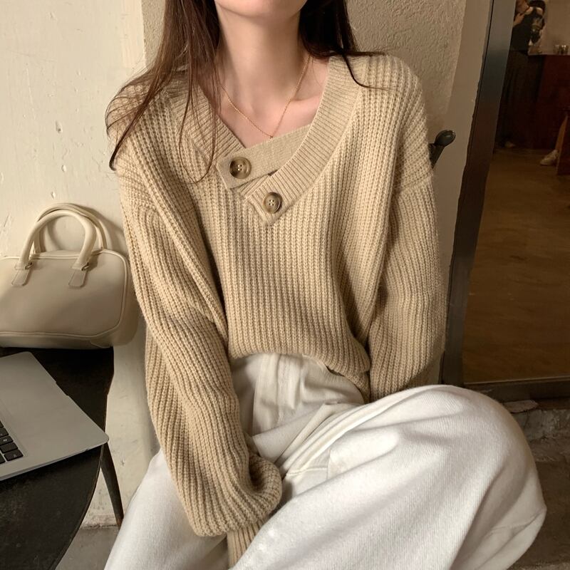 セーター レディース ニット トップス 長袖 Vネック プルオーバー ボタン リブニット シンプル 大人 おしゃれ 大人女子 ルーズ 無地 春 秋 冬 レディース お出かけ 休日 旅行 普段使い 韓国 ファッション スタイル 楽ちん 暖かい 体系カバー 送料無料 M L XL 2XL 3XL 4XL