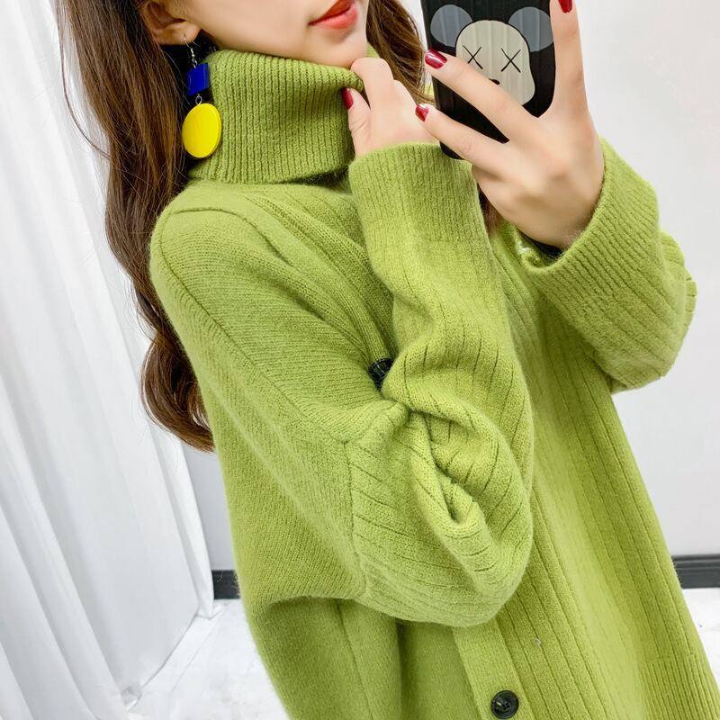 暖かさと上品さを兼ね備えた、女性らしいデザインのトップスです。ハイネックのタートルネックが、首元を暖かく包み込み、冷たい風をシャットアウト。飾りボタンがアクセントになっており、シンプルなデザインながらもおしゃれさを演出します。