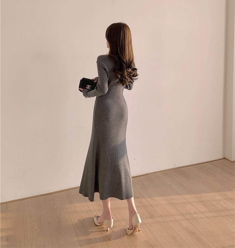ワンピース ニットワンピース ミモレ丈 長袖 オフショルダー ホルターネック スリット マーメードニット 大人 上品 おしゃれ セクシー エレガント 春 秋 冬 レディース デート お出かけ 休日 旅行 普段使い プレゼント 送料無料 S M L ブラック グレー