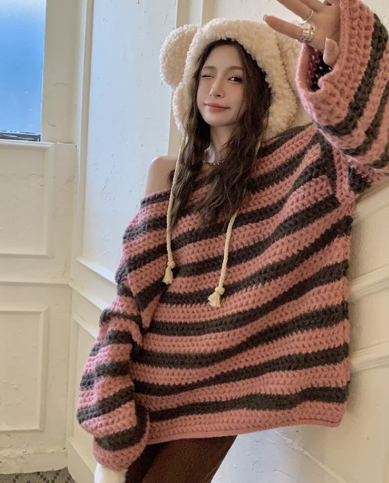 トップス セーター ロング丈 ロング 萌え袖 袖あり 長袖 プルオーバー かぎ編みニット ふわふわ ニット かわいい カジュアル おしゃれ 大人女子 ボーダー 春 秋 冬 レディース デート お出かけ 旅行 普段使い 韓国 ファッション スタイル 楽ちん 体系カバー 送料無料 S M L XL 2XL 大きめ ゆったり ブラウン ピンク