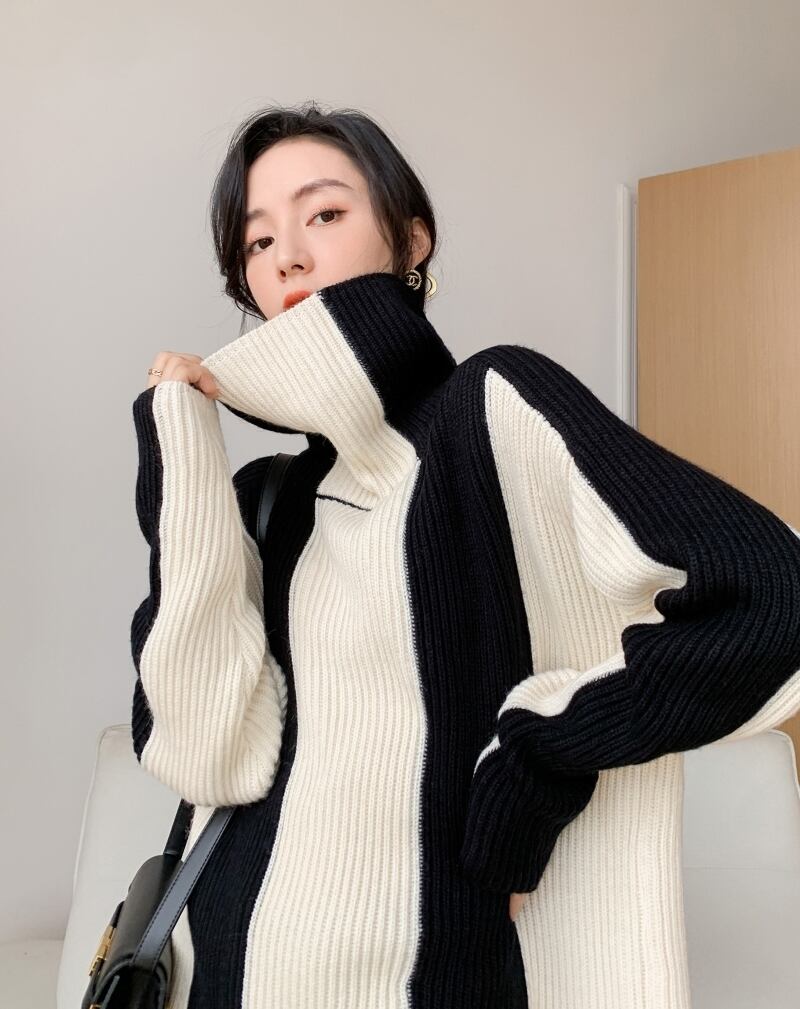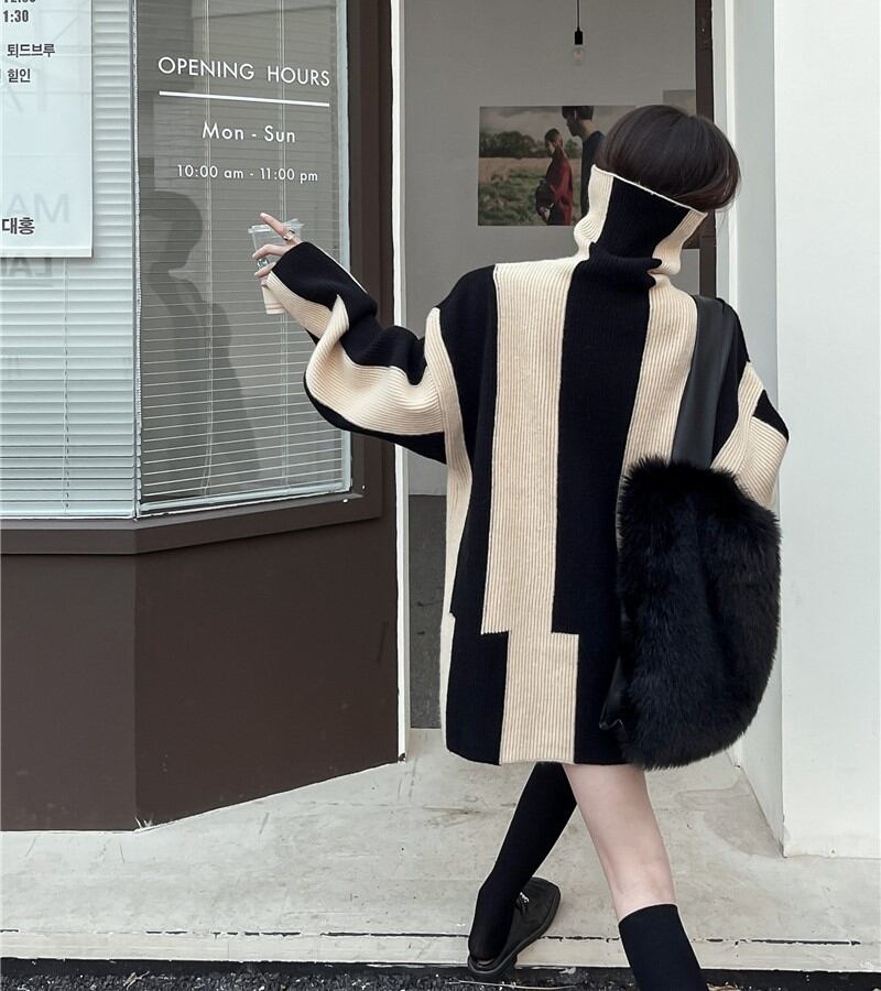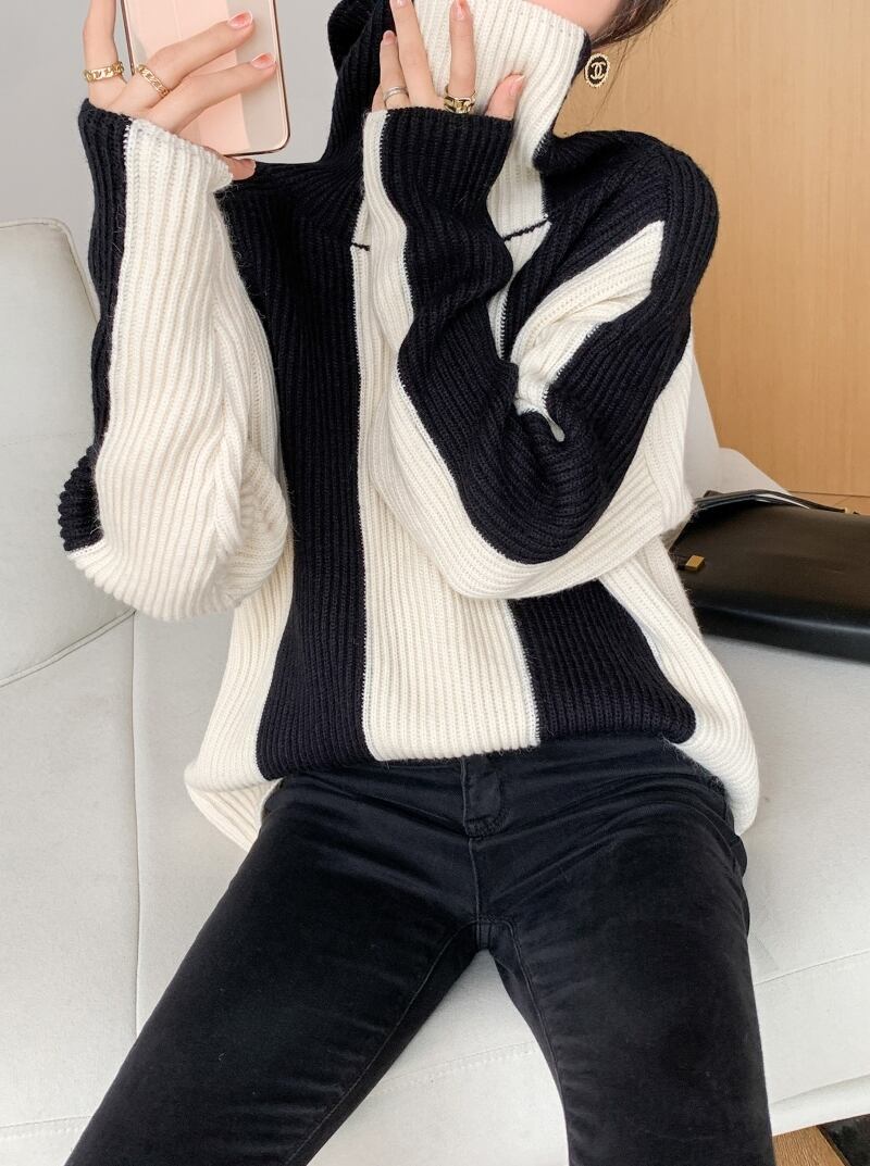 トップス セーター ニット ニットセーター レディース 長袖 ハイカラー ハイネック タートルネック プルオーバー ストライプ あったか 厚手 カジュアル 大人 おしゃれ お洒落 クール 春 秋 冬 レディース お出かけ 休日 旅行 韓国 ファッション スタイル 楽ちん 体系カバー プレゼント 送料無料 S M L XL ゆったり