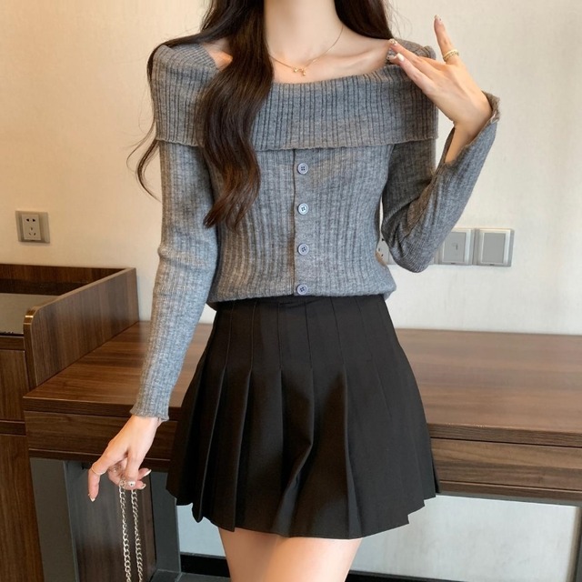 トップス プルオーバー フロントボタン ニット セーター 長袖 オフショルダー スリットスリーブ ワンショルダー 大人可愛い おしゃれ セクシー 存在感 春 秋 冬 レディース お出かけ 休日 旅行 普段使い 韓国 ファッション スタイル 暖かい 体系カバー 送料無料 M L XL 2XL 3XL 4XL 大きめ ゆったり ブラック グレー ベージュ モカ