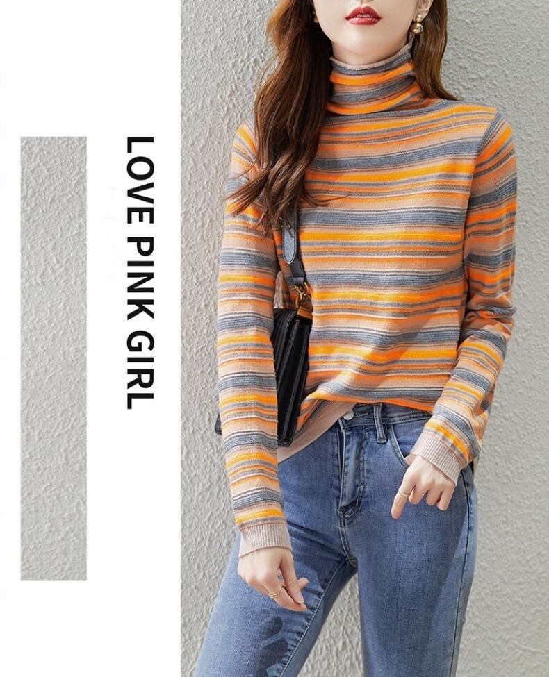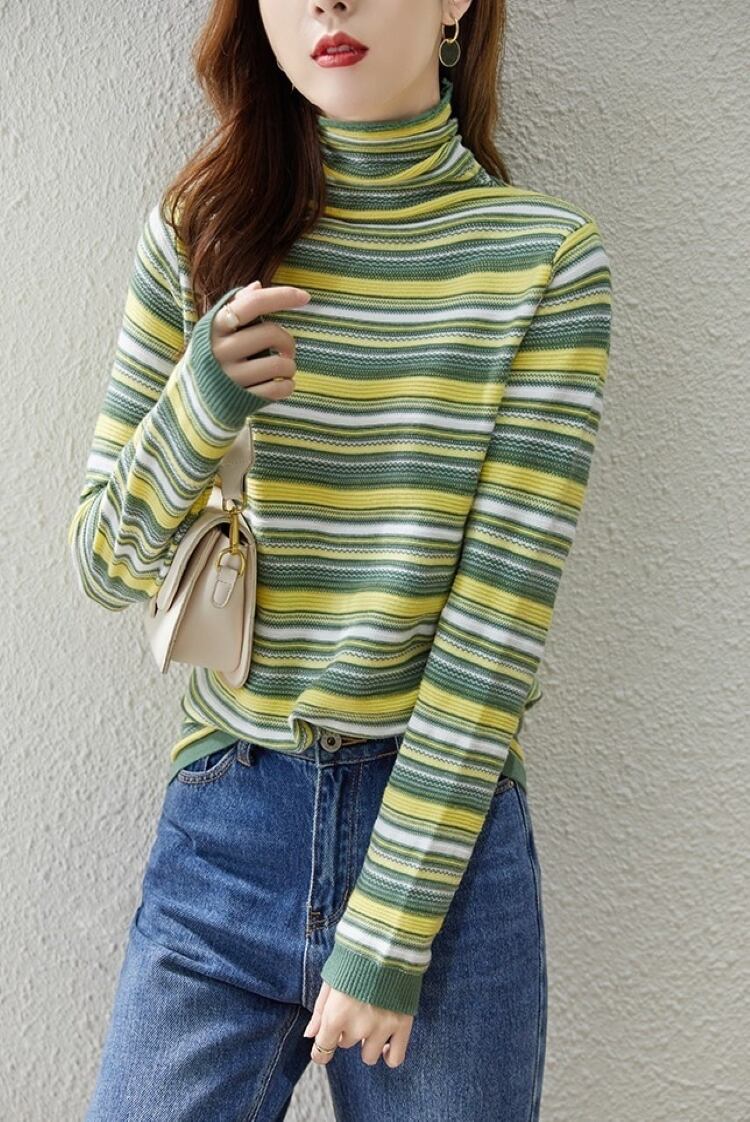 カラフルなレインボーボーダーがポイントで、程よいタイトなシルエットが女性らしさを引き立てます。タートルネックデザインなので、首元をすっきりと演出し、寒い季節にも暖かくおしゃれに過ごせます。