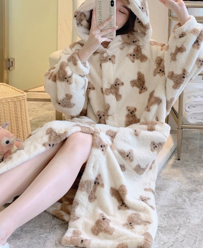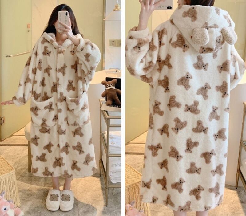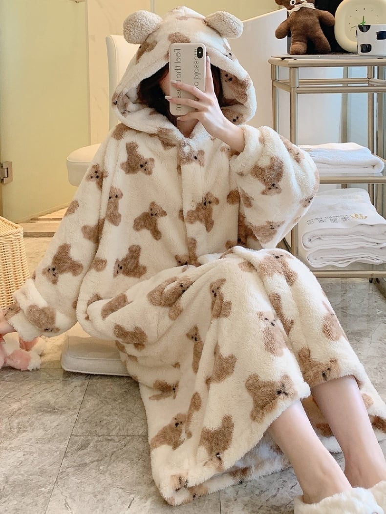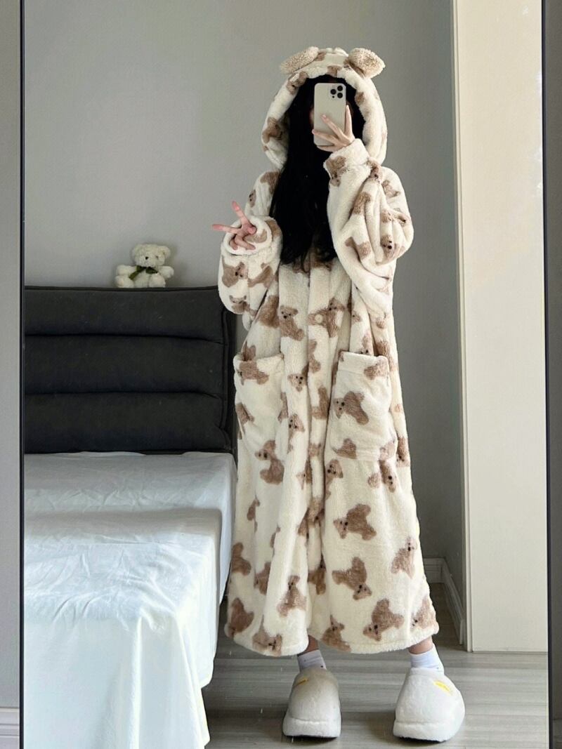 ルームウェア パジャマ 部屋着 ナイトウェア 着ぐるみ コスプレ フード付き 耳付き ワンピースローブ ガウン 着ぐるみ風 クマ かわいい キャラクター 秋 冬 レディース お泊まり 旅行 着回し 楽ちん 暖かい 体系カバー 送料無料 S M L XL 2XL 3XL 大きめ ゆったり サイズ