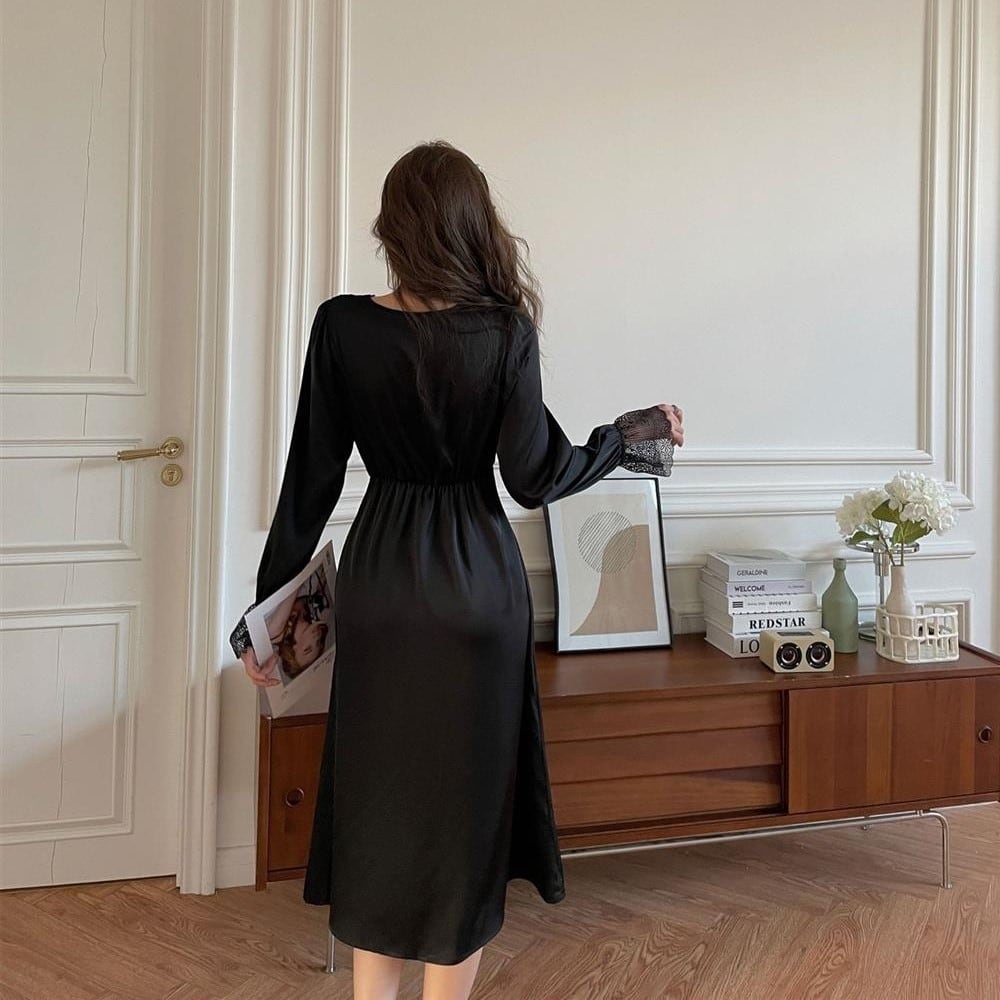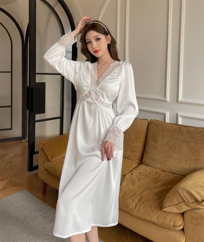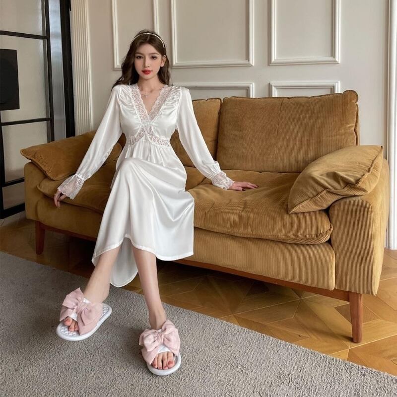 ワンピース ルームウェア パジャマ 部屋着 寝巻き ナイトウェア 長袖 Vネック レース 薄手 大人 上品 エキゾチック セクシー 春 秋 冬 レディース お泊まり 旅行 韓国 スタイル 送料無料 ホワイト ブラック