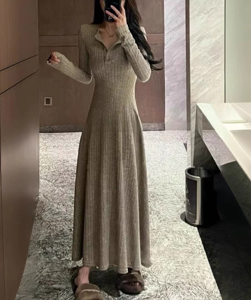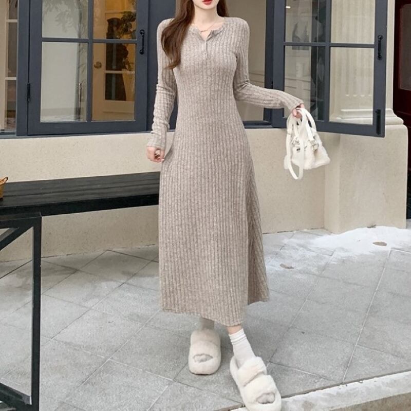 シンプルでおしゃれな存在感を放つニットワンピース。タイトなシルエットが女性らしさを引き立て、マキシ丈で体のラインをカバーしてくれます。伸縮性に優れた素材で作られているので、着心地も抜群です。