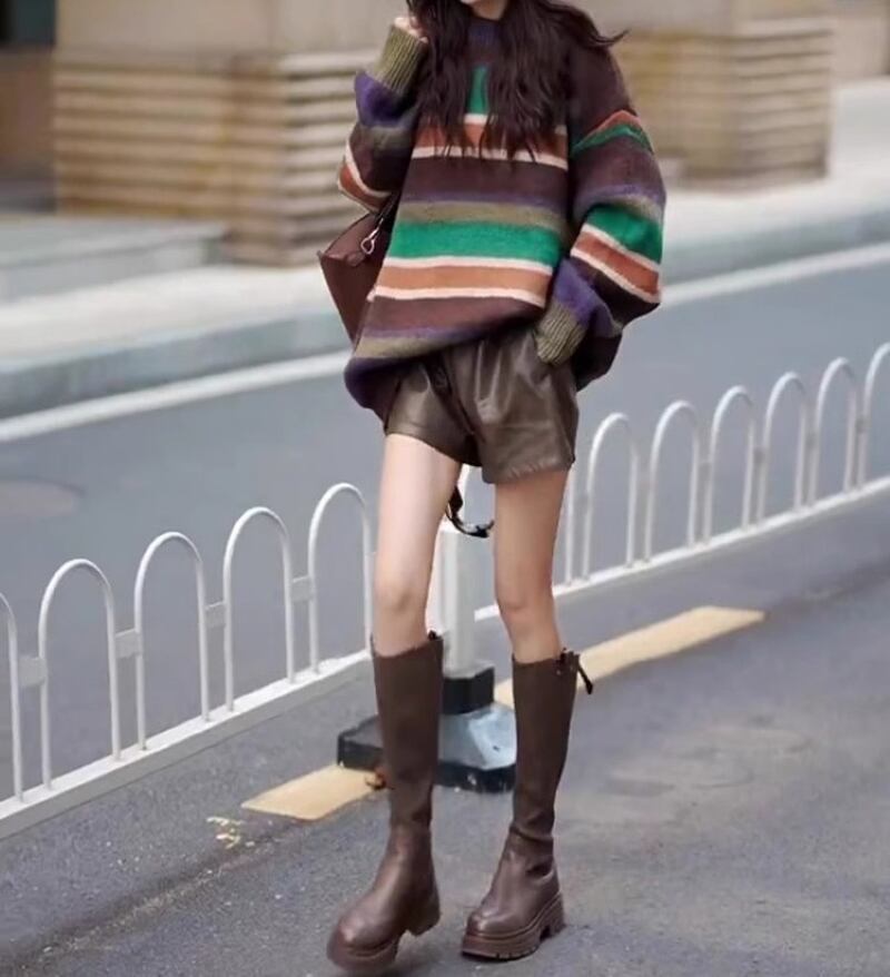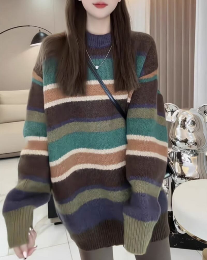 トップス ニットソー セーター 長袖 クルーネック 伸縮性 ニット 厚手 シンプル カジュアル おしゃれ レトロ メンズライク 個性的 ボーダー ストライプ 春 秋 冬 レディース お出かけ 休日 旅行 普段使い 韓国系 スタイル 暖かい 送料無料 S M L XL 2XL 3XL