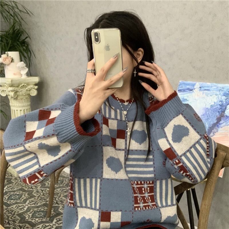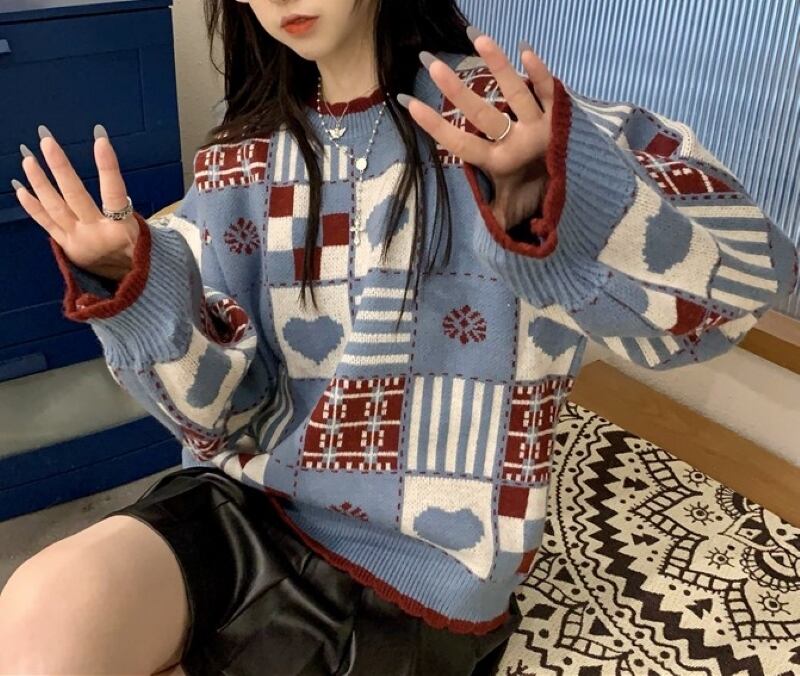 トップス セーター ニット 長袖 ニットセーター プルオーバー ハート チェック ラウンドネック かわいい 大人可愛い ラブリー 存在感 とろみ感 春 秋 冬 レディース 学生 お出かけ 休日 旅行 普段使い 韓国系 スタイル 暖かい 送料無料 S M L XL ブルー ベージュ