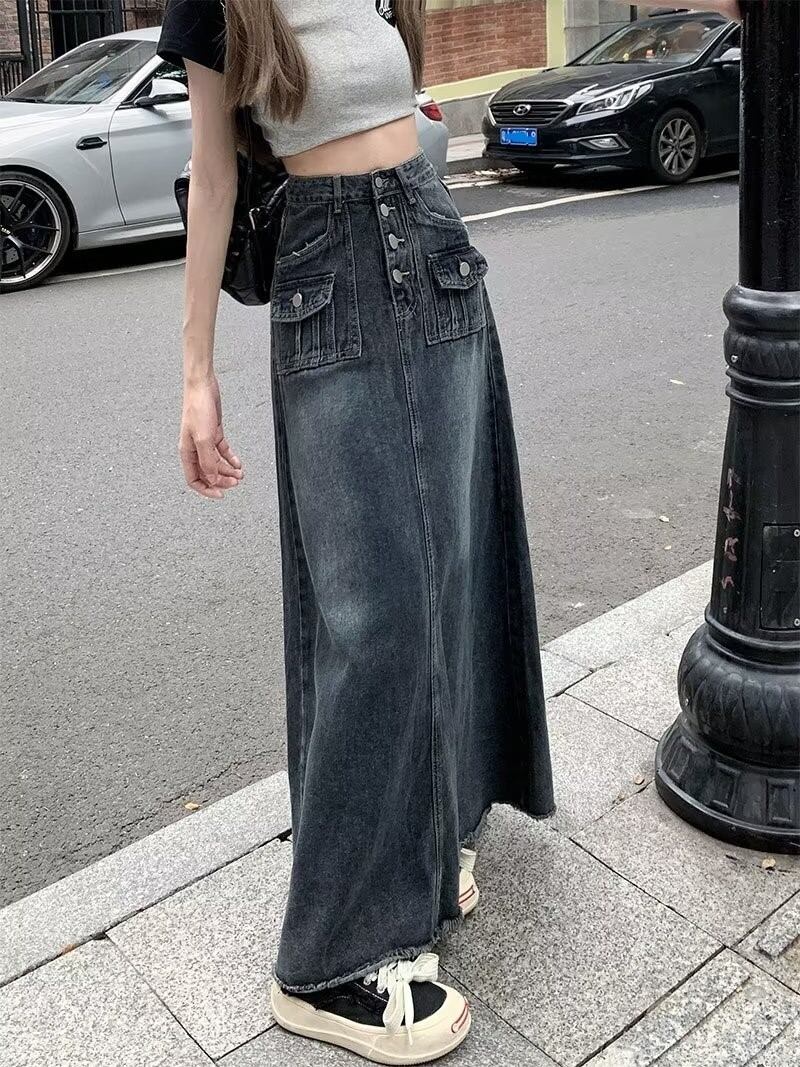 スカート デニムスカート ロング丈 ワイド Aライン ポケット ハイウエスト デニム カジュアル 大人 おしゃれ レトロ アジアン 無地 オールシーズン レディース デート お出かけ 女子会 休日 旅行 普段使い 韓国 ファッション スタイル プレゼント 定番 送料無料 S M L XL 2XL 3XL 4XL 5XL 大きいサイズ ゆったり