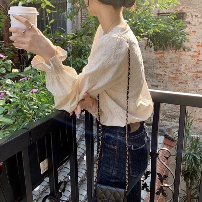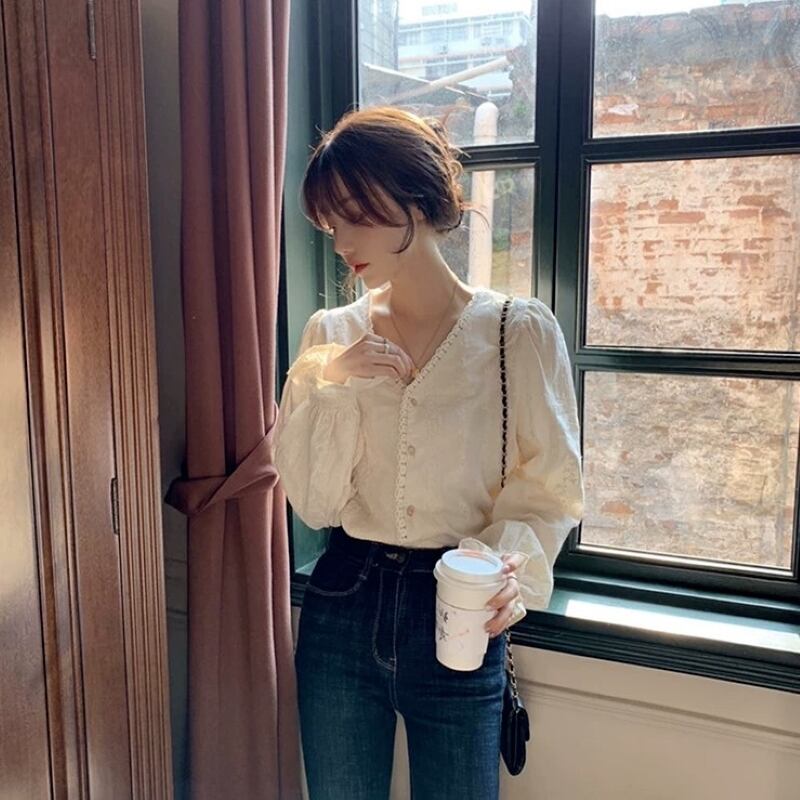 トップス シャツ ブラウス 長袖 Vネック レース 刺繍 シンプル 大人 上品 おしゃれ エレガント 無地 春 秋 レディース お出かけ 休日 旅行 普段使い 韓国 スタイル 送料無料 S M L XL 2XL