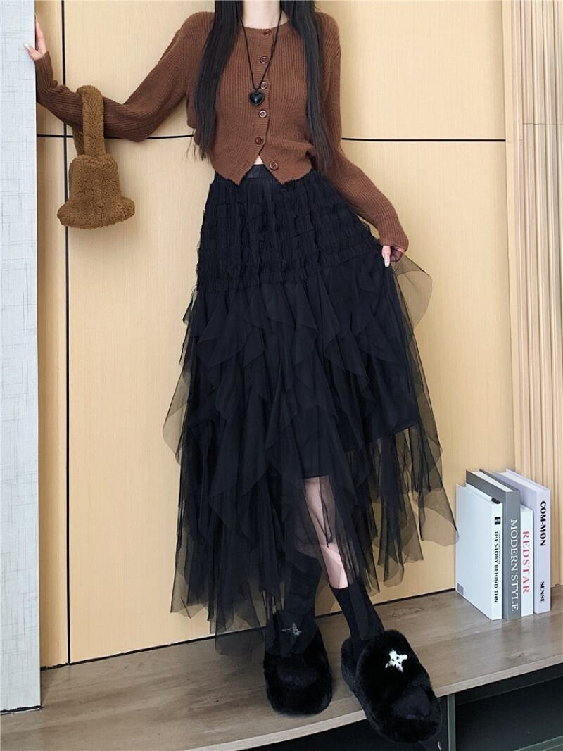 大人可愛いチュールスカート、Aラインのシルエットが女性らしさを引き立て、フリルやレースが存在感を演出します。ウエストはゴム仕様で楽ちんな着心地ながら、スタイルアップも叶います。