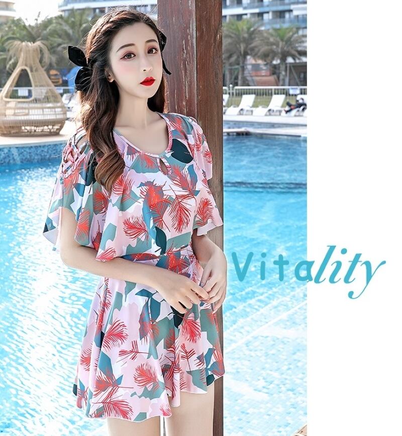水着 ワンピース水着 体系カバー水着 ワンピース セパレート 体系カバー 半袖 フリル 2点セット 大人可愛い カジュアル 大人っぽい 柄 レディース 脚長 送料無料 M L XL