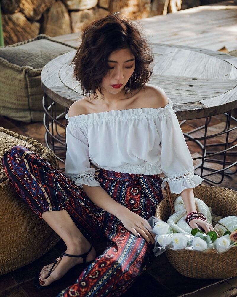 ショート丈で5分袖、オフショルダーにフリルが付いたトップス。女性らしさを引き立てるデザインが魅力です。シャツとブラウスの良いところを併せ持ったアイテムで、カジュアルからちょっとしたお出かけスタイルまで幅広く活躍します。柔らかな素材で着心地も抜群です。シンプルなボトムスと合わせるだけで、おしゃれなコーディネートが完成します。