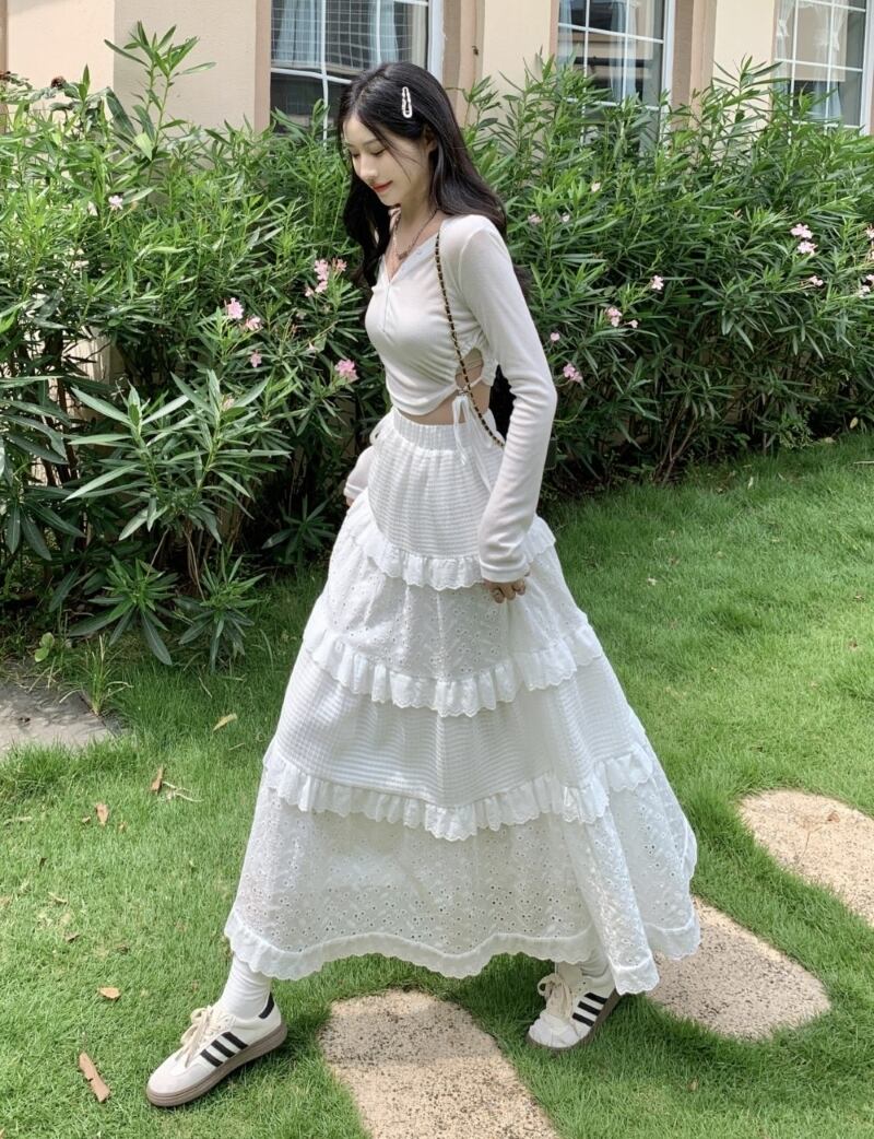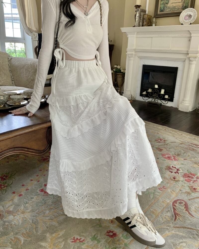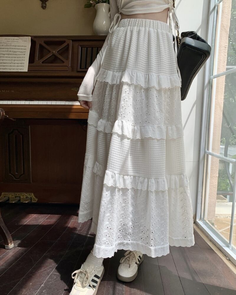 スカート ティアード レディース ロング丈 花柄 フラワー 刺繡 フレアスカート Aライン ハイウエスト ウエストゴム 透け感 大人可愛い おしゃれ アジアン キュート 存在感 無地 春 夏 デート お出かけ 旅行 普段使い 楽ちん プレゼント 定番 送料無料 S M L XL ホワイト