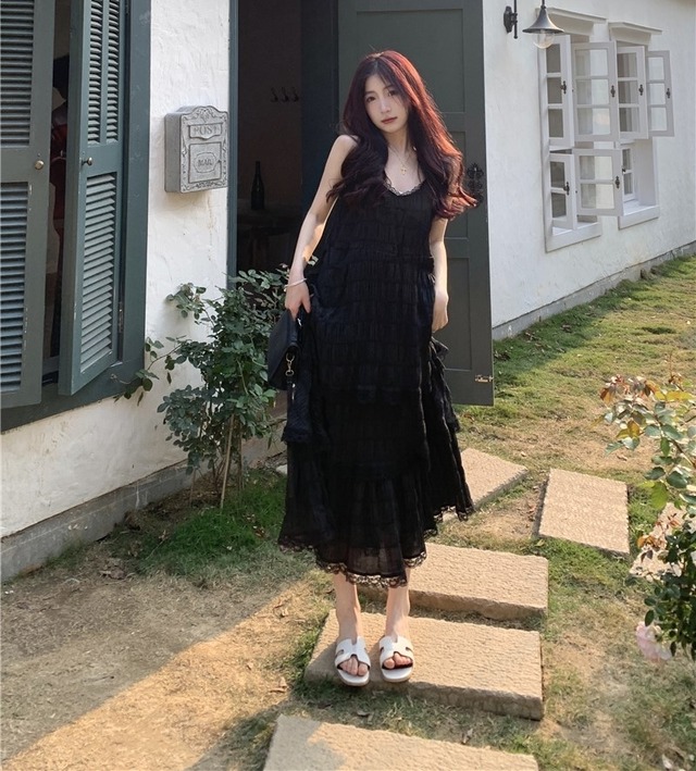 ワンピース ティアードワンピース フリルワンピース キャミソールワンピース ミモレ丈 ロング ノースリーブ Aライン フリル 透け感 大人可愛い おしゃれ キュート 存在感 抜け感 春 夏 レディース デート 休日 旅行 海 普段使い 楽ちん 体系カバー 定番 送料無料 S M L ホワイト ブラック